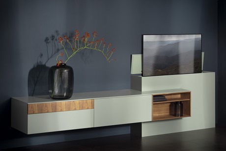 Interstar wil vooral in oplossingen denken. Dat betekent overigens allerminst dat Interstar zich niet vernieuwt. Want de mens verandert continu en ook de manier waarop hij zijn leven leidt, blijft geen tien jaar hetzelfde. Wat te denken van de televisie? Interstar heeft hier verschillende oplossingen voor, bijvoorbeeld de tv-lift: met één druk op de knop is het apparaat mooi weggewerkt. Verder eindeloze mogelijkheden qua wandsystemen, die nog altijd het hart van de Interstar-collectie vormen. Uit mooi afgewerkte modules – kasten, planken en wandpanelen – kan men naar eigen inzicht een kastenwand samenstellen. Daarin kan men audiovisuele apparatuur, een computer of verlichting integreren en de bijbehorende bedrading wegwerken.