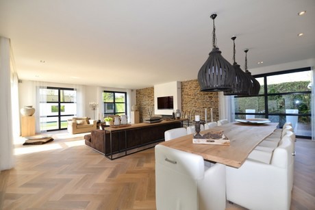 Door de combinatie van diverse aardetinten dwarrelt er ergens ook een sfeer van vroeger. Zie de specifieke elementen zoals de bijzondere lampenkappen boven de enorme eettafel, de antieke waterpotten en de matte moderne visgraatvloer. En ja, natuurlijk kunnen we er niet omheen... Die waanzinnig mooie muur met sfeer van puur natuursteen. Tezamen met de open haard: de eyecatcher van de woonkamer. Wat een sfeer, wat een gezelligheid. Een mooie balans tussen strak en warmte, zonder dat de kracht van het moderne aspect afneemt.