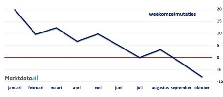 Voorzag in januari nog de helft van de detaillisten een omzetstijging in de komende maand, in oktober denkt nog maar een kwart van de ondernemers dat de komende maand meer omzet wordt geboekt ten opzichte van de afgelopen maand.