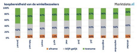 Men voorziet dan wel een afname van het aantal winkelbezoekers; de koopbereidheid staat per saldo nog wel positief. Maar ook hier neemt het aandeel detaillisten dat een toename van de koopbereidheid voorziet in de komende maand in rap tempo af, van 51 procent in januari tot 26 procent in oktober.