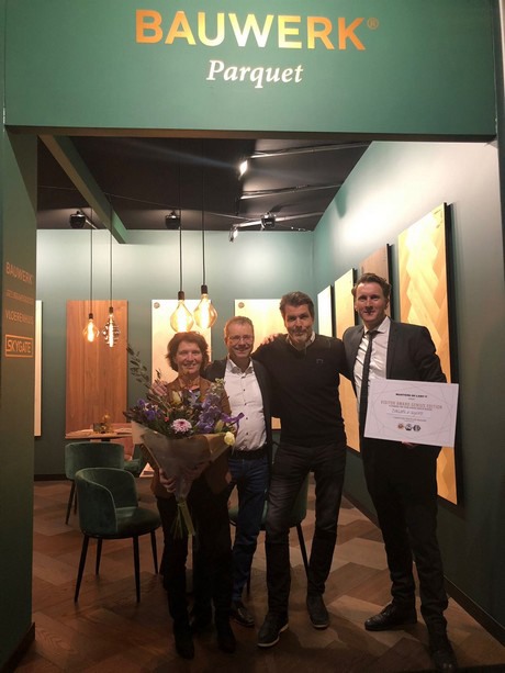 V.l.n.r. Joost de Bruijn (Plinten & Profielen Centrale B.V.), Andrea van Es (Vloerenhuis Amsterdam), Dave van Maanen (Vloerenhuis Amsterdam), Anne-Marleen & Paul de Nooy (Skygate - Stalen binnendeuren) Jim Bouwmeester (Jim Bouwmeester Vloeren) bij de winnende stand.