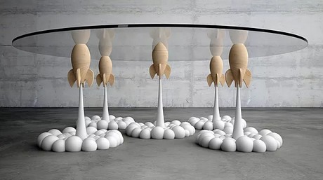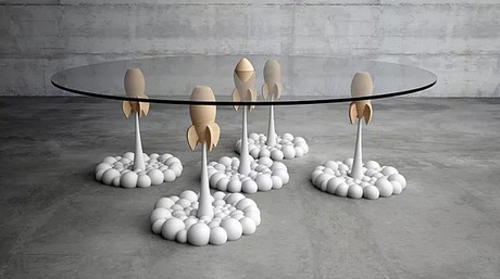 De in Cyprus gevestigde ontwerper Stelios Moussaris heeft een nieuwe opvallende salontafel gecreëerd. De ronde salontafel bestaat uit een glazenplaat, die wordt ondersteund door vijf poten. De vijf tafelpoten hebben de vorm van gelanceerde raketten, compleet met gasuitstoot. De naam van de tafel is dan ook de Rocket Table.