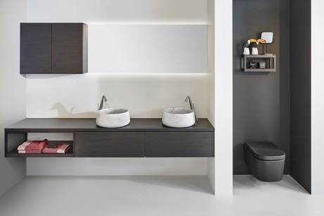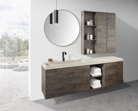 Het nieuwe assortiment spiegels met zwarte randen doet het overigens al super. Maar als kroon op een super deluxe badmeubel kan men voortaan ook kiezen uit een collectie marmerbladen en bladen uit beton. Zo wordt de keuze compleet naast het kunstmarmer, solid surface, mineral stone en de keramische wastafels."