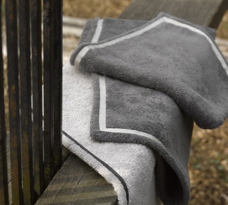 "In het oneindige met Bodi. Deze nieuwkomer in de badlinnen collectie is een tijdloze klassieker voor badkamer, boot, zwembad of strand… Door de afwerking met luxueus geribd lint ontstaat een mooi grafisch lijnen- en kleurenspel tussen het opgestikte lint en de heerlijk zachte badstof."