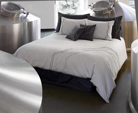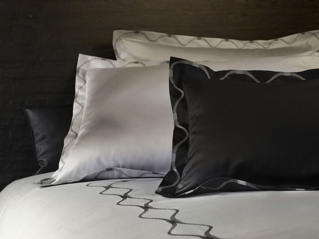 "Zwart-wit dans met Marilo. Deze collectie slaagt erin om het grillige en elegante lijnenspel en de unieke kleurencombinaties van marmer door te vertalen tot in de slaapkamer. Deze uitgesproken en (natuurlijke?) collectie versterkt het karakter van elk interieur."