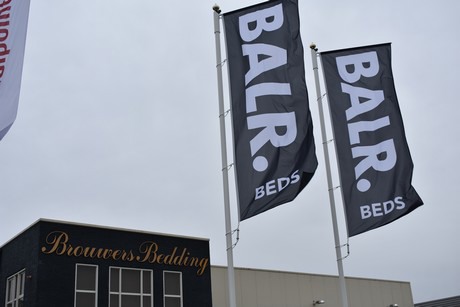 Voor het pand van Brouwers Bedding wapperen de BALR.-vlaggen.