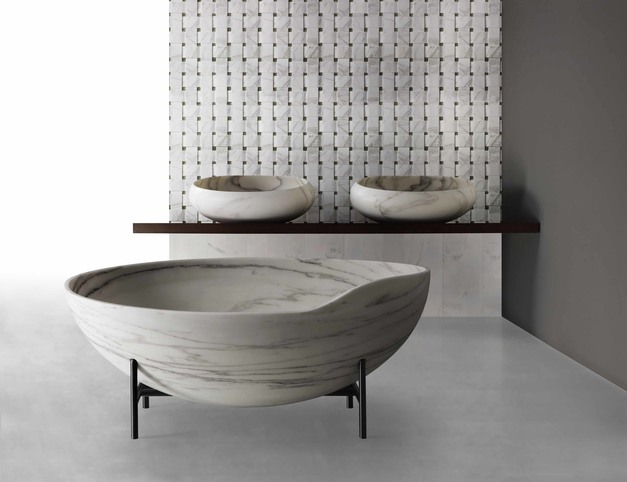 Het bad Kora (een ontwerp van Enzo Berti) van het merk Kreoo is gesneden uit een enkel blok marmer. Het rust op een ijzeren statief dat het volume ondersteunt en lichtheid geeft.