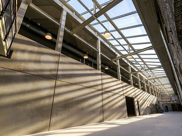 Een glazen overkapping tussen het oude en het nieuwe deel van de winkel wordt straks een van de eyecatchers. Hierdoor is een duidelijke overgang van het monumentale deel, naar het spiksplinternieuwe winkelgedeelte ontstaan. Door de enorme hoeveelheid licht die hier naar binnen stroomt, voelt het straks of je als klant even naar buiten loopt met je winkelkar voordat je verder loopt naar het restaurant, de designafdeling en de kassa's...