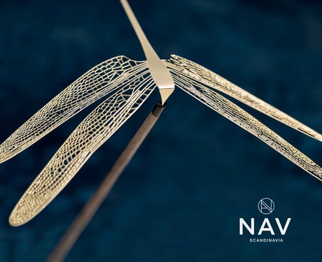 Het eerste opvallende ontwerp dat de Deense designstudio NAV Scandinavia heeft uitgebracht is de Dragonfly. "Dit ontwerp is geïnspireerd door het natuurlijke evenwicht van de libel. Het is een elegant designobject, een combinatie van ongelooflijk veel detail en een delicate balans. Het stuk is geïnspireerd door een houten speelgoed, gespot door ontwerper Jørgensen tijdens een van zijn reizen in Indonesië. Gefascineerd door de fijne balanspunt, zette hij het lokale ambacht om naar een geraffineerd ontwerp in metaal om een uniek modern design object te creëren", weet Indra.