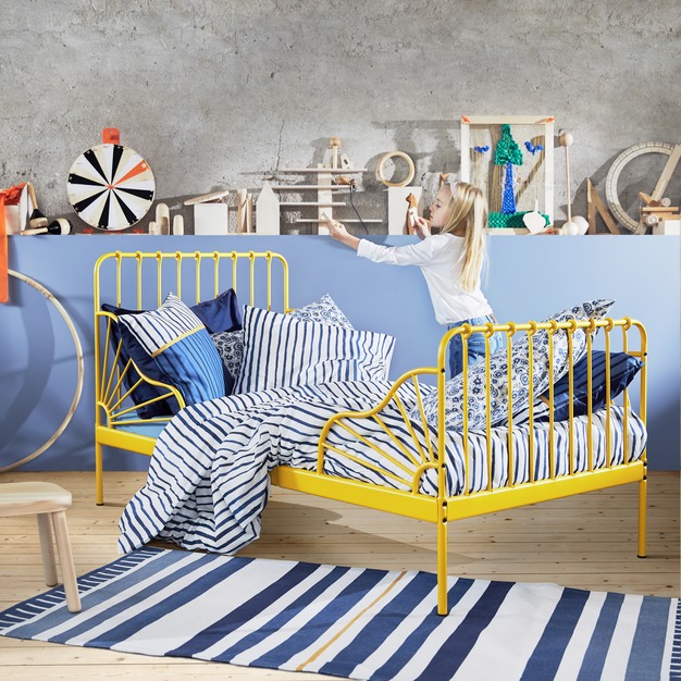 Het metalen SAGSTUA bedframe met golvend hoofdbord is klassiek en een tikkeltje romantisch. Een ontwerp met een knipoog naar het verleden en tegelijkertijd ook met een moderne uitstraling. Ook voor de kinderen is er een mooi metalen bed in knalgele kleur: het MINNEN uitschuifbare bed groeit letterlijk met het kind mee. Ook is er nieuw bedtextiel verkrijgbaar.