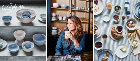 Het servies heet ‘Mil & Match’ omdat volgens Miljuschka de eettafel een lust voor het oog moet zijn. “De ene keer kun je het met één kleur strak en rustig indekken. De andere keer doe je alles in een andere tint: aards naturel, warm roze of bruisend blauw… net hoe je je voelt!”