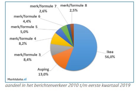 In het onderzoek is ook bekeken over welke merken matrassen en winkelformules het meest is gecommuniceerd op social media. Hieruit blijkt dat 56 procent van het berichtenverkeer betrekking heeft op de matrassen van Ikea. Op de tweede plaats staat Auping met een aandeel van 13 procent.