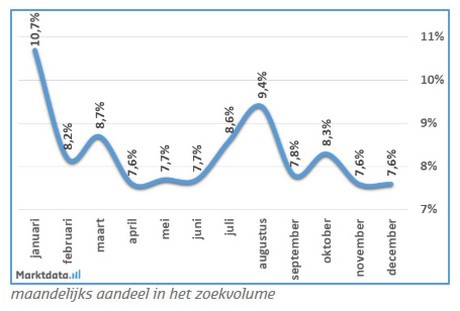 Januari en augustus blijken de belangrijkste zoekperioden te zijn. In die twee maanden wordt er relatief het vaakst gezocht naar matrassen.