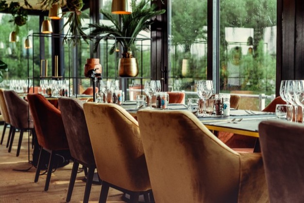 Beneden in het restaurant heeft Dôme Deco de kleuren goudgeel, terracotta en bruin gecombineerd aansluitend aan de opdracht. De kleuren werden gebruikt in de stoelen, decoratie, verlichting en placemats. De populaire Marais bistro-tafels zorgen voor de nodige comfortabele eetruimte voor twee personen.