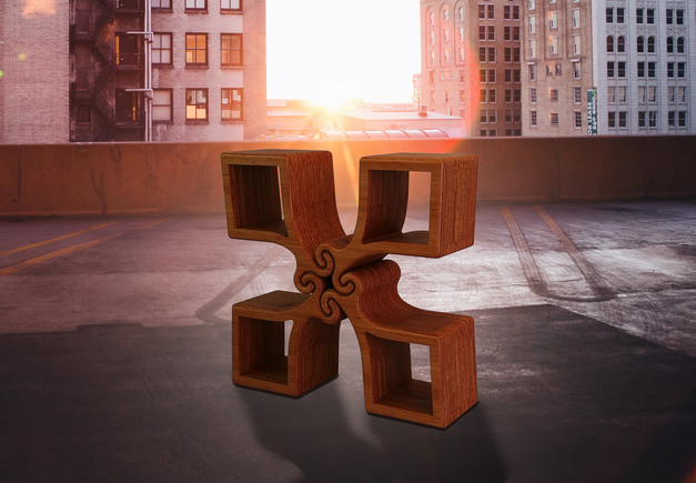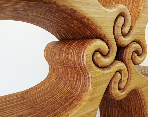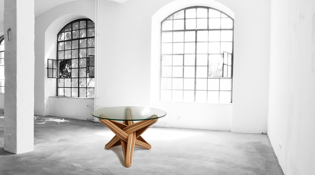 Salon-tafel “Lock” is opgebouwd uit lagen bamboefineer. De vorm wordt bepaald door de natuurlijke buiging van bamboe: er komt geen vormmal aan te pas. Eenmaal verlijmd ontstaat een dynamische sterke vorm waarbij de onderdelen elkaar vastklemmen.