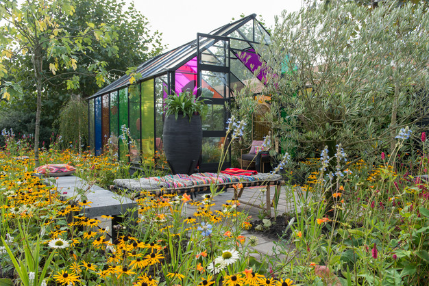 De digitalisering verbreedt en versmalt onze wereld waardoor we neiging hebben om in een eigen bubbel, met enkel gelijkgestemden, te leven. Deze trend Blended Cultures doorbreekt dit en laat grenzen vervagen. In deze voorbeeldtuin vind je daarom een mix van materialen, werelden en culturen. Ook is plaats voor een zeer bonte mix van verschillende planten. Die zijn onder meer terug te vinden in een groene wand. Natuurtinten spelen met de felle accentkleuren. Zo krijgt een kas een exotische uitstraling door de ruiten te voorzien van kleurfolie. Meubels en accessoires zijn een mix van lokaal en globaal en geven een vrolijke, ongedwongen en folkloristische sfeer. Planten, zowel inheems als exotisch, zijn aantrekkelijk voor tuindieren en insecten. Hemelwater wordt opgevangen in regentonnen of kan direct de bodem inzakken in de royale borders.