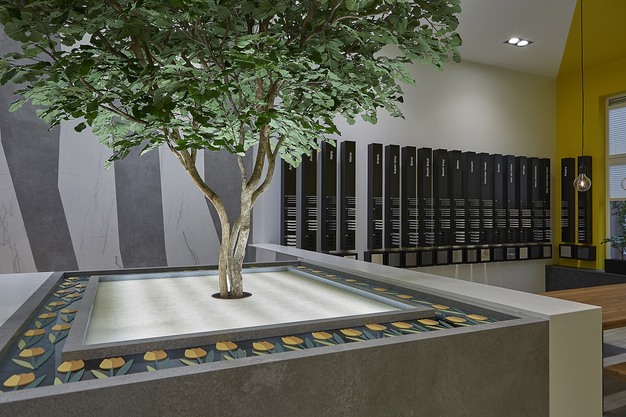 Verder is er een retailruimte met een schoonheidssalon en barber-shop. Deze ruimte is gecreëerd om een winkel/bedrijfsruimte te laten zien. Een andere bezienswaardigheid is de fontein in de entree van de showroom. In het midden staat een olijfboom, die omringd wordt door van Neolith gemaakte tulpen, uitgesneden met water-jet-techniek, tweedimensionaal en op levensechte schaal. Bij deze bijzondere fontein is het water vervangen door Magna Glaskeramik in finish polished. Het reflecteert het blauw van de lucht, dat te zien is door het glazen dakraam precies boven de fontein.