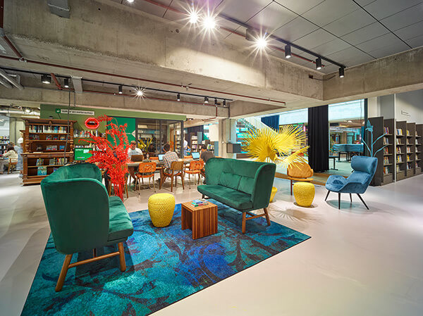 Hij plaatste leslokalen en ateliers als boxen in de ruimte en liet ze omkleden met halfhoge boekenkasten, zodat je nog steeds open zicht hebt. DOK wist veel bestaande boekenrekken te recyclen, aangevuld met heel veel vintage kasten van de kringloop, welke zijn aangepast aan de eisen van de bieb door het binnenwerk te veranderen. “Interieurontwerper Sandra Planken van Studio NOUN is verantwoordelijk voor de ‘edgy’ sfeer. Zij leverde bijzondere elementen, zoals meubelen die het interieur net wat meer karakter geven. Net als de oude kasten waarvoor ze stad en land afzocht.” Het interieurplan kwam ook in co-creatie tot stand, tussen architect, interieurontwerper én het eigen team. “Samen met Satelliet kozen we bewust voor meubelen die iets warms uitstralen, maar ook comfortabel zijn. Mensen zitten hier soms uren te werken of te lezen, dus dan mag het lekker zitten. We gebruiken mooie, tactiele materialen, rijke kleuren en veel planten”, vertelt Bradley. “Er zijn zitjes met oorfauteuils waar je je even lekker kunt terugtrekken, maar de meeste focus ligt op tafels die uitnodigen tot ontmoeting en gesprek, dat is ook de co-creatie en interactie die we willen aanmoedigen.”