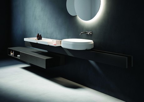 Rigo is een badkamermeubel systeem dat nauw is geïnspireerd op architectuur.Twee parallelle balken lopen over de muur om een lineaire mogelijkheid te creëren om de wastafel en de accessoires erop te leggen. Met een gedetailleerde set laden en kasten kan het systeem diverse configuraties aannemen. De combinatie van marmer, hout en geanodiseerd aluminium voegt esthetiek toe en laat de rijkdom van de combinatie van verschillende materialen zien.