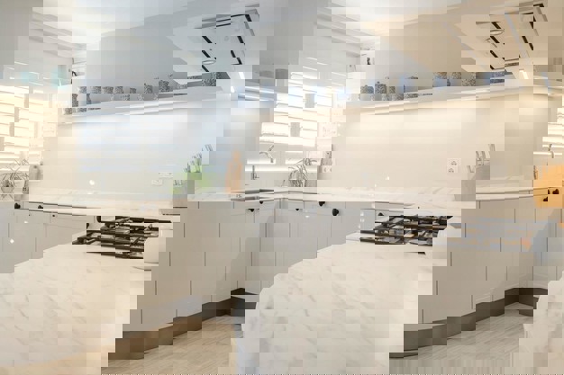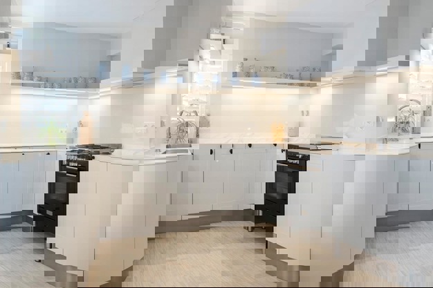 "Deze keuken in wit zijdemat gelakt kenmerkt zich door de geronde fronten en plinten. De ronde fronten zijn gecombineerd met rechte fronten die voorzien zijn van een kader. Robuuste sierplanken met led-strip zorgen voor voldoende werkverlichting. Het topcore werkblad in een marmer print volgt niet alleen de kasten perfect maar is ook doorgezet als vensterbank (uit 1 stuk) en spatrand op de muur."
