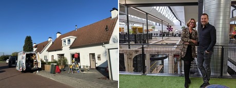 Links: Verduurzaming door Reimarkt van een van de Domijn wijken. Rechts Wilma van Ingen en Herwin ter Riet van Domijn.