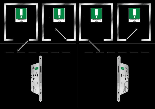 De vluchtrichting geeft de zijde aan waar de kruk het slot volledig ontgrendelt. Om het slot te laten functioneren heeft de deur een kruk met gedeelde krukstift of een vaste knop-krukcombinatie met wisselstift nodig.