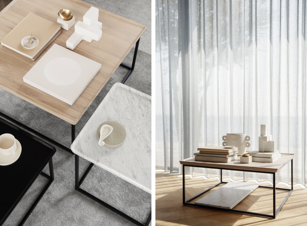 Een paar slimme details geven de tafeltjes een extra functionaliteit. Zo verandert de bijzettafel in een handomdraai in een krukje annex voetenbankje door er een bijpassend kussen op te plaatsen. Ook kan er worden gekozen voor een model met een handige lade onder het tafeltje. De salontafel kan ook worden uitgebreid met drie verschillende onderplaten, natuursteen, graphite bruin of carrera.