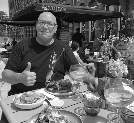 Peter op het terras bij Bar-Restaurant Kantoor op het Westergasterrein in Amsterdam.