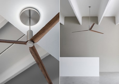 De ventilator is verkrijgbaar in vier verschillende afwerkingen, de lamellen zijn gemaakt van hout met essentie van Canaletto walnoot, natuurlijk eiken, wit of zwart mat geverfd. De structuur van de lamellen is stabiel en resistent gemaakt dankzij de koolstofvezel. Het plafondverankeringselement bevat controle-eenheid, motor en technologie, en het is volledig gemaakt van AISI 316L roestvrij staal met satijn en gepolijste afwerkingen Ontwerp Natalino Malasorti.