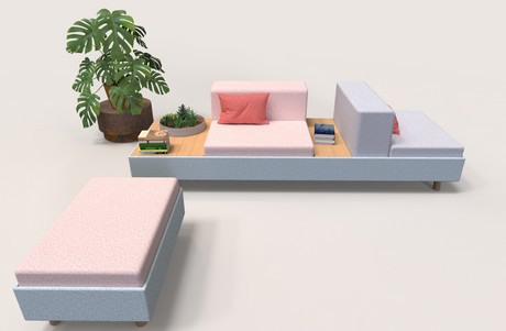 Met de elf elementen kunnen veel verschillende combinaties gemaakt worden. De bank kan vrij in de ruimte geplaatst worden, zodat alle kanten benut worden. Voorzien van houten bakken met gestoffeerde onderdelen waar de gebruiker spullen in op kan bergen, of te gebruiken als bijzettafeltje. Wanneer de grote houten bak in het onderstel van de poef wordt geplaatst ontstaat er een salontafel.