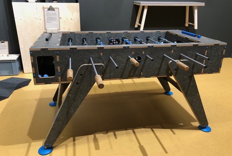 Vloerproducent Forbo Flooring presenteerde onlangs een tafelvoetbaltafel, gemaakt van oude treinvloeren op de Wastebuild-beurs in Amsterdam.
