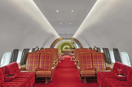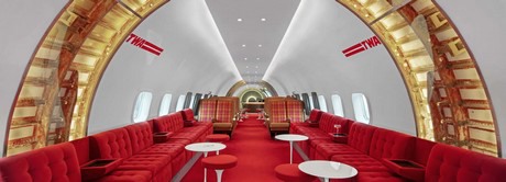 Vintage details zoals cocktailzwaarden, bordspellen van weleer en de iconische TWA rode loper laten gasten terug in de tijd reizen naar toen de TWA-terminal werd geopend in 1962. Onder leiding van Sara Duffy van Stonehill Taylor's combineert de enscenering van het interieur een goede mix van vintage en moderne meubels. Het middelste gedeelte van het vliegtuig is vervangen door moderne suede sofa stoelen langs de raamzijde van het vliegtuig om een bredere doorgang te creëren voor gasten die zo toegang kunnen krijgen tot de bar. Aan de achterkant van het vliegtuig zijn zes passagiersstoelen gestyled door Aaron Sciandra, die de vintage-geïnspireerde stoelhoezen ontwierp om de esthetiek van de jaren 60 te resoneren. De passagiersstoelen zijn voorzien van voldoende beenruimte om een bijzettafel te kunnen bieden waar gasten hun drankjes op kunnen plaatsen.