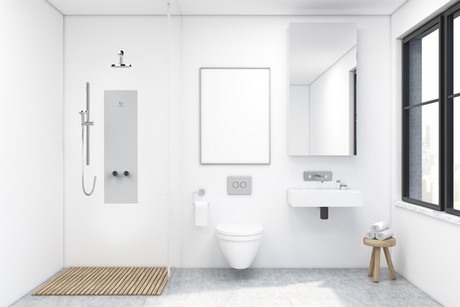"Wij hebben ook een hele mooie samenwerking met Hamwells", gaat de eigenaresse verder. "Zij heeft een uniek douchesysteem ontwikkeld met ingebouwde douchepijp WTW, die 2blueconomy op haar beurt weg kan zetten in de markt. Dit douchesysteem verbruikt 1.8 liter warm water per minuut en bespaart om die reden veel energie. Anders dan een traditionele douchepijp WTW kan de Blue geplaatst worden op één verdieping en is daardoor goed toepasbaar in 7 miljoen woningen die nog gerenoveerd moeten worden. Ook in nieuwbouw is de Blue toepasbaar. Alle onderdelen zitten gemonteerd op een frame dat gemakkelijk door één persoon te plaatsen is."