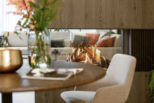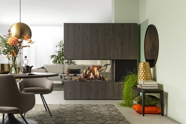 Kalfire heeft ook een nieuwe serie roomdividers ontwikkeld. Het voordeel van een haard als roomdivider is dat je hiermee gemakkelijk grotere ruimtes kunt indelen. Ook is het mogelijk om vanuit alle hoeken het vlammenspel te aanschouwen. De nieuwste GP115/75R en GP115/55R zijn voorzien van drie verschillende ‘om de hoek’ opties: naast de standaard achterwand bestaat nu de optie voor een achter- én zijwand (links of rechts). Hiermee wordt het mogelijk om de haard op een hoek te laten uitsteken, bijvoorbeeld in kamers met een L-vormig oppervlak. De vernieuwde optie creëert daardoor een maximale vuurbeleving vanuit meerdere hoeken in de ruimte.
