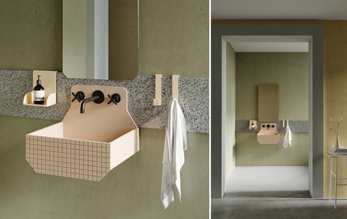 De architecturale benadering van de ontwerpers omvat de volledige ruimtelijke dimensie van de badkamer: via een soort muurband wordt de positie van de wastafel bepaald. Op deze manier kunnen accessoires zoals spiegels, planken en handdoekhaken gemakkelijk worden bevestig en wordt de wastafel als het ware aangekleed.