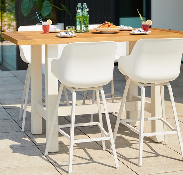 Sinds vorig jaar ziet Hartman steeds meer hoge tafels terugkomen in de tuinontwerpen. Dit is niet voor niets. Aan een hoge tafel zit je automatisch actief. Ook kun je aan een hoge tafel gemakkelijk meerdere plaatsen creƫren. Want naast de zitplekken kan er ook gestaan worden.