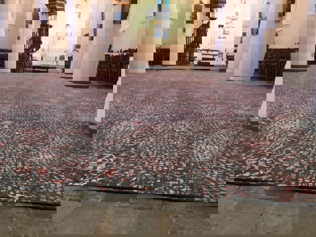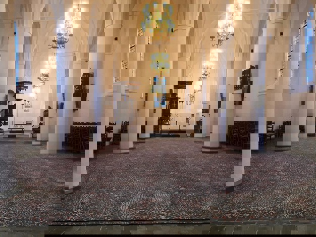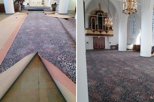 Joldersma Wonen: ''In de 600 jaar oude kerk in Sleen hebben we deze bijzonder mooie opdracht mogen uitvoeren. De 50 jaar oude heuga tegels zijn vervangen voor kamerbreed tapijt van Desso type Fresco. We hebben het gelegd en afgewerkt als een vloerkleed van 8 x 12 meter midden in de kerk. Het is een mooi plaatje geworden!''