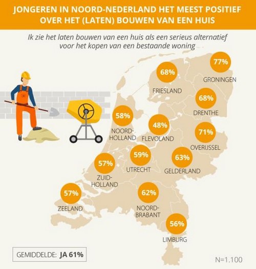 Vooral de inwoners van de noordelijke provincies zien het kopen van een kavel, om daar een eigen bouwproject te starten, als een populair alternatief (72 procent) voor projectbouw of een koopwoning. In het Westen van Nederland is dit veel minder populair; hier ziet slechts 58 procent zelfbouw als een serieuze optie. “Door het ruimtegebrek in de Randstad, ligt de gemiddelde kavelprijs daar veel hoger dan in het Noorden”, zegt Ibrahim Agdere van Offerteadviseur. “Hierdoor krijg je in het Westen voor hetzelfde geld, veel minder grond. Je levert hierdoor of in op de kavelgrootte, of je houdt minder geld over voor de bouw van je huis.”