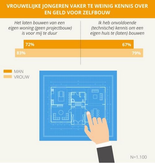 Ondanks de grote bereidheid tot zelfbouw onder jongeren, vindt 77 procent van de ondervraagden het te duur. Agdere: “Een kavel kopen en daar vervolgens je eigen huis neerzetten, kost behalve geld ook ontzettend veel tijd. Ondanks dat je per vierkante meter minder betaalt dan bij seriebouw, kan het stress opleveren en daarmee vergaande impact hebben op bijvoorbeeld je prestaties op werk en/of relatie.”