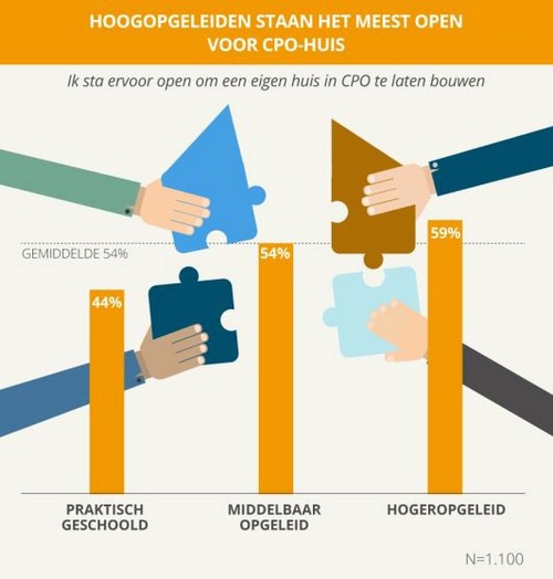 Een oplossing waarbij je de vrijheid van zelfbouw behoudt maar de kosten aanzienlijk lager zijn, is Collectief Particulier Opdrachtgeverschap (CPO). CPO is een vorm van sociale projectontwikkeling waarbij toekomstige bewoners de gezamenlijke opdrachtgever zijn van hun eigen nieuwbouwproject. 88 procent van de starters op de woningmarkt wist voorafgaand aan het onderzoek niet wat CPO inhield. Na uitleg gaf 54 procent aan open te staan voor een CPO-project. Agdere: “Tijdens een CPO-project richt je samen met anderen particulieren een stichting of vereniging op, bestaande uit de toekomstige bewoners. CPO kan bijvoorbeeld heel interessant zijn voor vriendengroepen. Deze kennen elkaar al jarenlang, hebben vaak dezelfde ideeën en wensen en kunnen goed met elkaar samenwerken.”