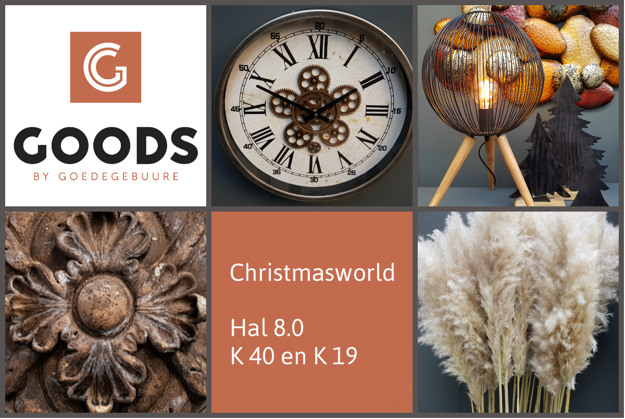 Goods by Goedegebuure staat voor het eerst met twee stands op Christmasworld 2020 in Frankfurt. In hal 8.0 stand K 40 presenteert de importeur klokken via hun befaamde klokkenwand, lampen, woonaccessoires, (kerst) musthaves en decoratie. Schuin tegenover K 40 is stand K 19 die helemaal gewijd is aan droogbloemen, Pampas en veel andere grassen.
