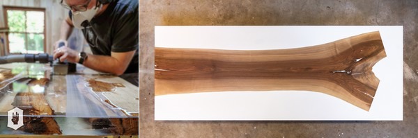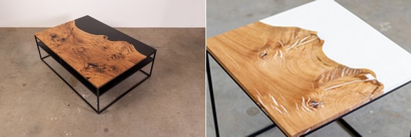 De meeste meubelontwerpen worden in opdracht gemaakt. Jeroen vindt het mooiste aan zijn werk om zijn verhaal te verbinden met het verhaal van de klant. “Sinds een tijdje werk ik met epoxy. Jaren geleden ben ik daarmee gaan experimenteren. Ik werk veel met organische vormen. Gaandeweg wilde ik voor de buitenvormen iets rechts, iets sobers. Zo ben ik bij expoxy terecht gekomen. Nu creëer ik daarmee het organische binnen in de tafel en een strakke buitenkant. Epoxy bestaat uit twee componenten die vloeibaar zijn, zodra ze worden samengevoegd hard het uit. Als het eenmaal in de tafel gegoten is dan kan ik er niks meer aan veranderen. Het ontwerp moet van te voren helemaal goed zijn. Daarna wordt de tafel al dan niet voorzien van een vernis laag. Niet iedereen wil de sporen van zijn leven in de tafel blijven zien.”