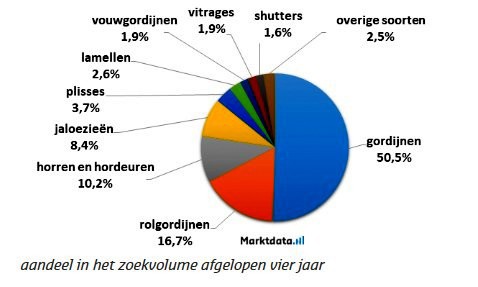Ruim de helft van het zoekvolume naar soorten raambekleding heeft betrekking op gordijnen. Op de tweede plaats staan rolgordijnen met een aandeel van 16,7 procent in het zoekvolume. De categorie horren en hordeuren heeft een aandeel van 10,2 procent in het zoekvolume. Daarnaast wordt er ook veel gezocht naar jaloezieën.