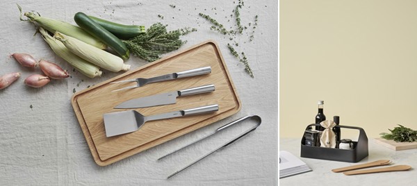Het Deense designmerk Stelton heeft nieuwe producten aan de collectie toegevoegd, waaronder de Sixtus snijplank en grillset. De snijplank met een diepe, praktische sap groef is gemaakt van FSC-gecertificeerd, massief Europees eiken; een duurzaam en antibacterieel, natuurlijk materiaal wat tevens gebruiksvriendelijk is voor de keukenmessen. De grillset bestaat uit een vleesmes en vleesvork, grilltang en grillspatel met een glanzende afwerking. Alle onderdelen zijn van roestvrijstaal en beschikken over het bekende Stelton-DNA, waar strakke lijnen en hoge kwaliteit kenmerkend zijn.