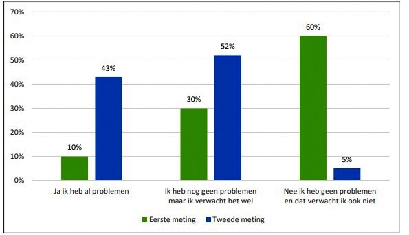Van de 230 ondernemers die de online enquête voor de tweede meting hebben ingevuld, ervaart 43% op dit moment al negatieve gevolgen van het coronavirus. Dat is een stijging van 33% in 3 weken tijd. Het percentage ondernemers dat nog geen problemen heeft, maar die wel binnenkort verwachten is met 22% gestegen naar 52%. Bij de eerste meting verwachtte het merendeel (60%) van de respondenten dat het coronavirus geen negatieve gevolgen zou hebben voor hun bedrijf. Drie weken later is dat percentage gedaald van 60% naar 5%.