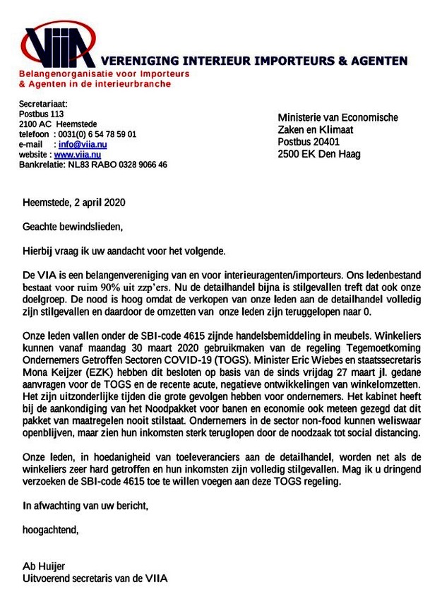 "Als belangenvereniging voor interieuragenten/importeurs staan wij voor de handelsbemiddeling in meubels en aanverwanten", meldt VIIA. 90% van onze leden zijn zzp'er. Nu de detailhandel is stilgevallen als gevolg van de maatregelen voor Covid-19, treft dit ook onze doelgroep. De omzetten vallen bij velen zelfs voor 100% weg. De overheid heeft met de TOGS maatregelen een tegemoetkoming voor ondernemers opgezet en daar sinds kort ook de detailhandel Non-Food in opgenomen. Echter de SBI code 4615 zijnde handelsbemiddeling meubelen valt daar niet onder. Het zijn uitzonderlijke tijden voor iedereen, met grote gevolgen voor ondernemers. Als VIIA vereniging voor de interieur importeurs en agenten hebben wij dan ook de overheid aangeschreven met het verzoek deze SBI code toe te voegen aan de TOGS regeling. Zo kunnen ook onze zzp leden deze noodsituatie correct overbruggen en kunnen we de keten straks weer volledig opstarten zodra de maatregelen dit toelaten."