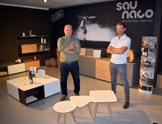 Eigenaar Peter van Winkel van Saunaco (rechts) met collega Henk Vrancken op de najaarsvakbeurs in De Woonindustrie.