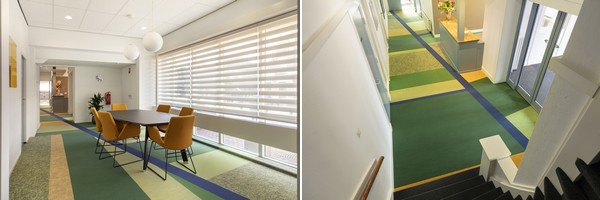 De Flotex vloeren van Forbo Flooring boden de architecte de ontwerp-flexibiliteit en de kleuren om haar dessin te realiseren. Elk gewenst ontwerp is mogelijk met Flotex en kan zo in de vloer gedrukt worden. De vloer biedt daarnaast het voordeel dat het gemakkelijk schoon te maken is (zowel nat als droog), het vangt fijnstof op met haar vezels die ook weer zo opgezogen kunnen worden en het heeft bovendien uitstekende akoestieke kwaliteiten.