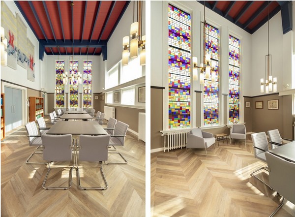 In de raadszaal van het kantoor is gekozen voor Allura Wood, ook van Forbo, dat gelegd is in Hongaarse punt en daarmee prima past bij de prachtige klassieke glas-in-lood ramen. Ton Projectstoffering uit Beek en Donk legde de vloeren.