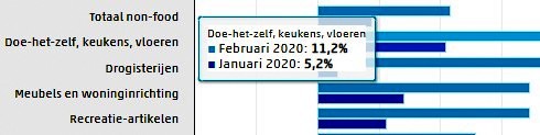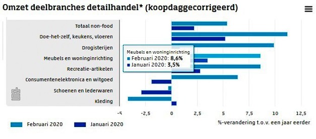 De winkels in doe-het-zelfartikelen, keukens en vloeren, meubels en woninginrichting, consumentenelektronica en witgoed realiseerden in februari de grootste omzetstijging.